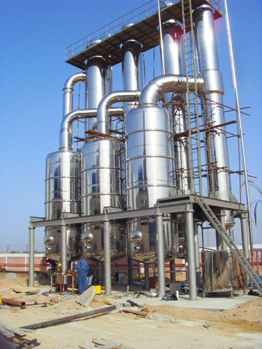 各效蒸發(fā)器、各效分離器、冷凝器、熱壓泵、真空及排水系統(tǒng)、各效料液輸送泵、操作平臺(tái)、電器儀表控制柜及閥門、管路等系統(tǒng)組成。